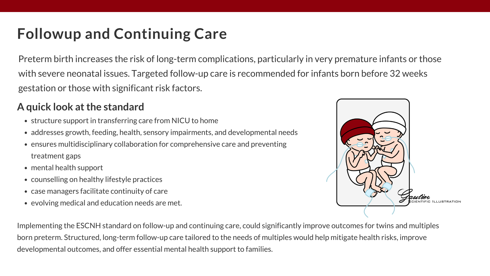 The ESCNH, developed by the European Foundation for the Care of Newborn Infants (EFCNI), consists of 11 key areas designed to improve outcomes for preterm and high-risk newborns across Europe. However, as our abstract highlights, these guidelines don’t specifically address the unique needs of multiple births—a crucial gap considering the higher risks these babies face.
