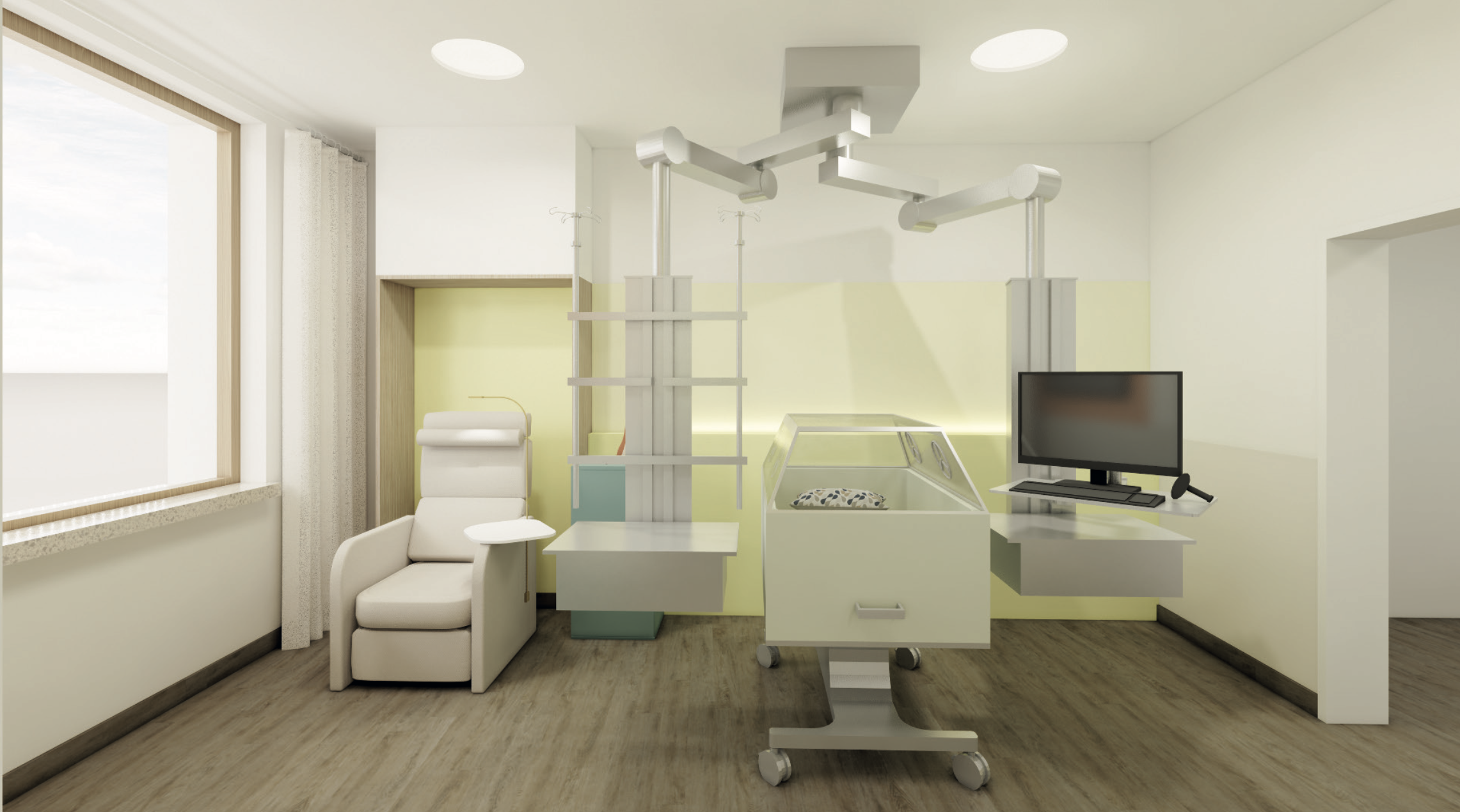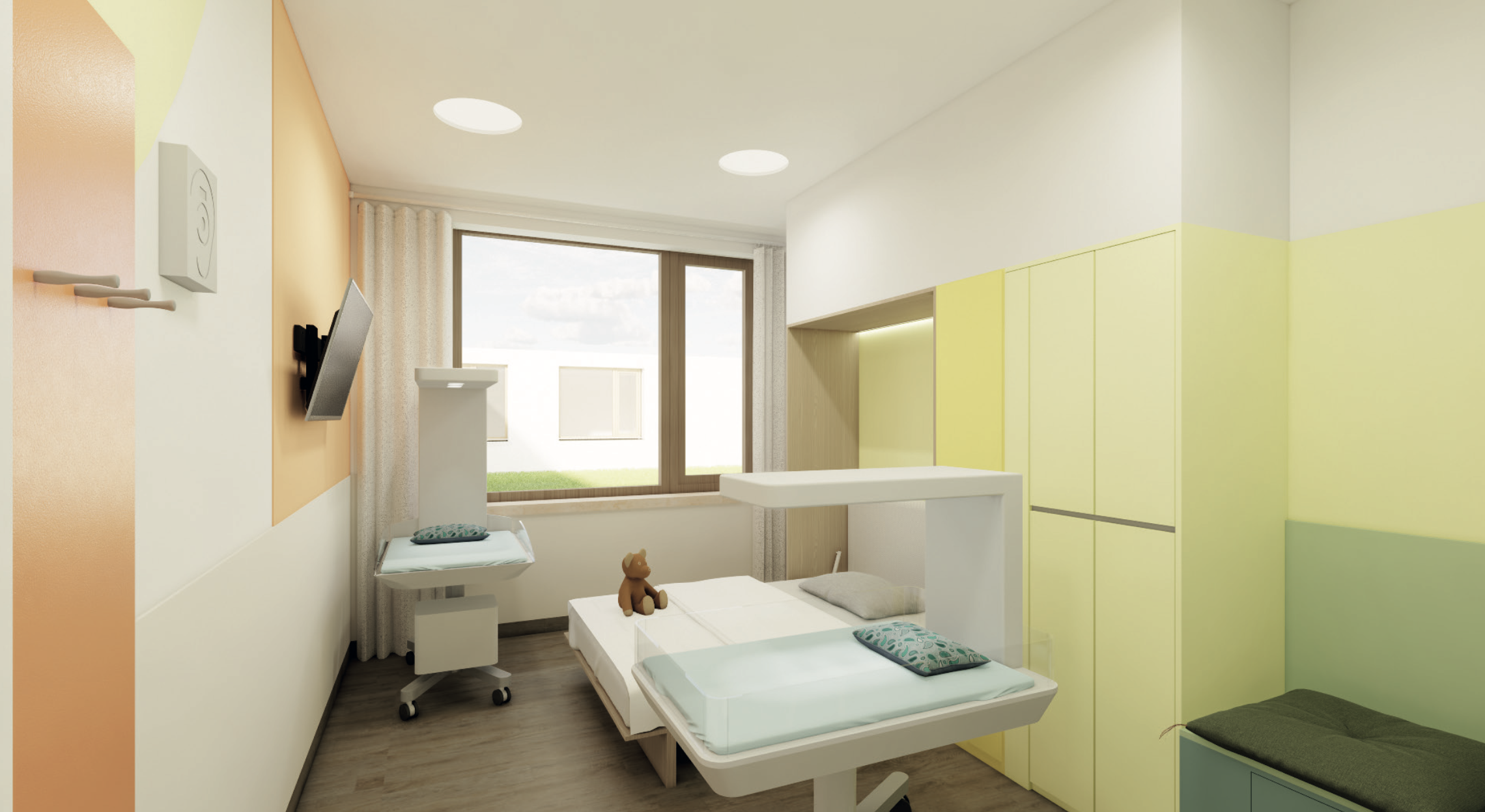 Couplet care units, based on examples from Sweden, are planned for the neonatology department. These are divided into a maternity room and a NICU room, which are connected by a large sliding door. This allows for privacy, if needed, and, on the other hand, the greatest possible closeness.